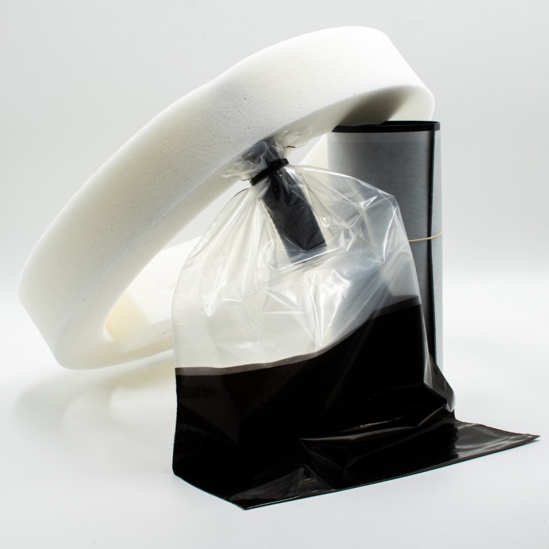 La feuille noire est recouverte à l'intérieur d'un film de colle de contact (sans solvant) pour faciliter le montage et empêcher les chenilles processionnaires de grimper le long de la feuille et de descendre par le tube dans le sac où elles sont retenues.